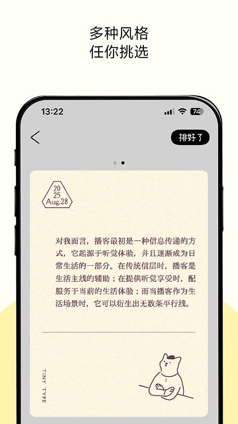排版小动物app(Tinytype)是一款充满温情与创意的文字记录与排版工具,专为追求个性化记录体验的用户打造。排版小动物app汇聚了来自世界各地的可爱动物角色,如日系风格的猫咪tsuki、北欧极简风的小狗拉尔夫、旅行明信片风的小信鸽路易等,每个角色都拥有独特的排版风格与专属模板。用户只需输入标题和内容,选择心仪的小动物,即可一键生成精美卡片,将日常心情、书摘、灵感等转化为视觉享受。同时,排版小动物app支持卡片保存至专属“动物纸箱”,方便归档与查找,同时支持一键分享至社交平台,与好友共享美好瞬间。此外,排版小动物app还提供自定义署名、桌面小组件等贴心功能,让记录更加便捷有趣。无论是日记、摘抄还是灵感捕捉,它都能以温暖治愈的方式,陪伴用户记录生活中的每一个精彩瞬间,有需要的用户可以在本站免费下载使用。