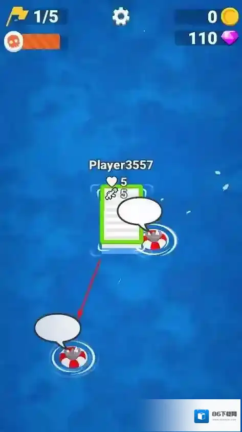 1.进入游戏后在初始海域拖动木筏移动,点击屏幕下方武器按钮切换标枪、炸弹等攻击方式,靠近敌筏时自动发动攻击。