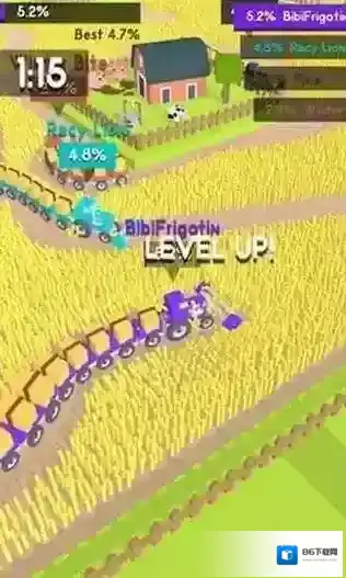 1、在游戏中操控收割机(如紫色收割机),按箭头指示在农田行驶,收割作物,注意屏幕上方进度(如5.2%)和剩余时间(1:15)。