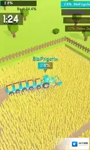 3、更换收割机(如蓝色收割机)后,按箭头指引在黄色作物农田中行驶收割,提升进度(如2.8%),争取超越对手,获得更好成绩。