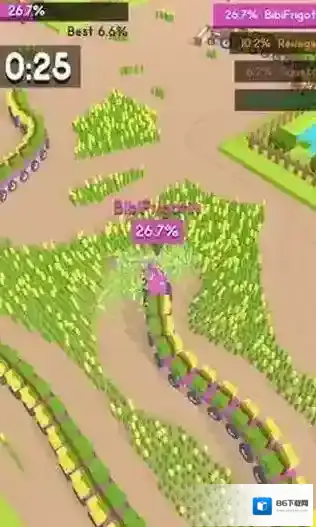 2、继续游戏,按箭头方向操作收割机(如紫色收割机)在不同农田区域作业,提升收割进度(如26.7%),留意剩余时间(0:25)和对手进度。