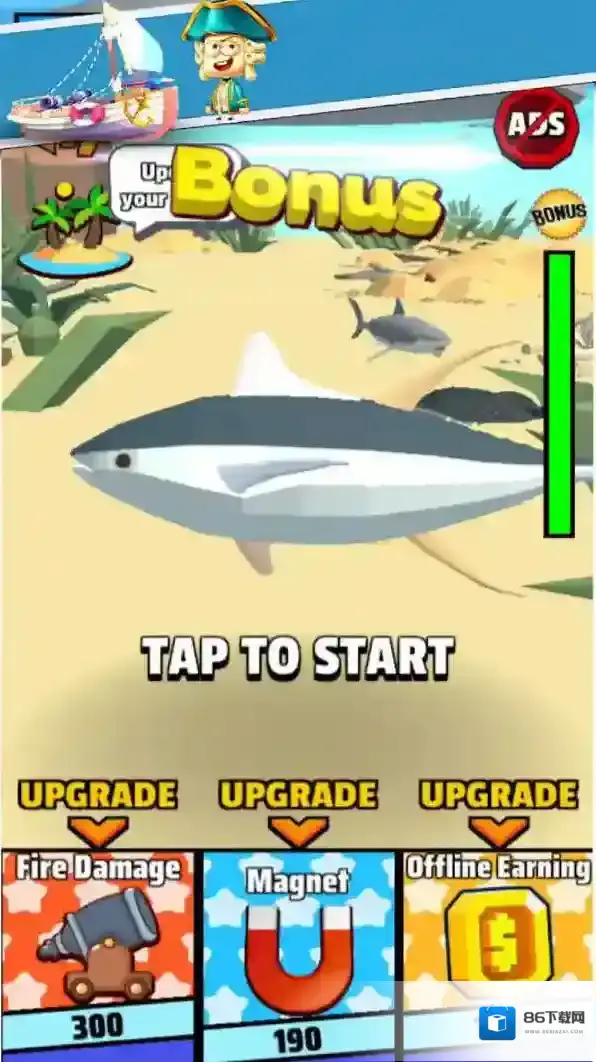 1、点击TAP-TO-START,开启海上冒险,可先升级(如Magnet、Fire-Damage),增强船只战斗能力。