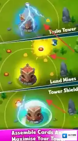 3、“组合卡牌”,装配特斯拉塔、地雷等卡牌,策略搭配,最大化塔楼防御效果。