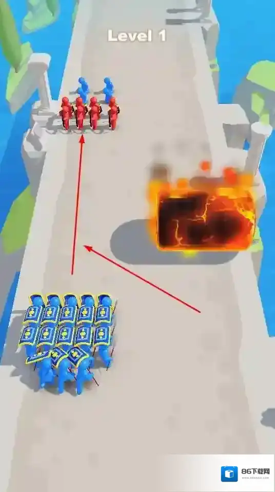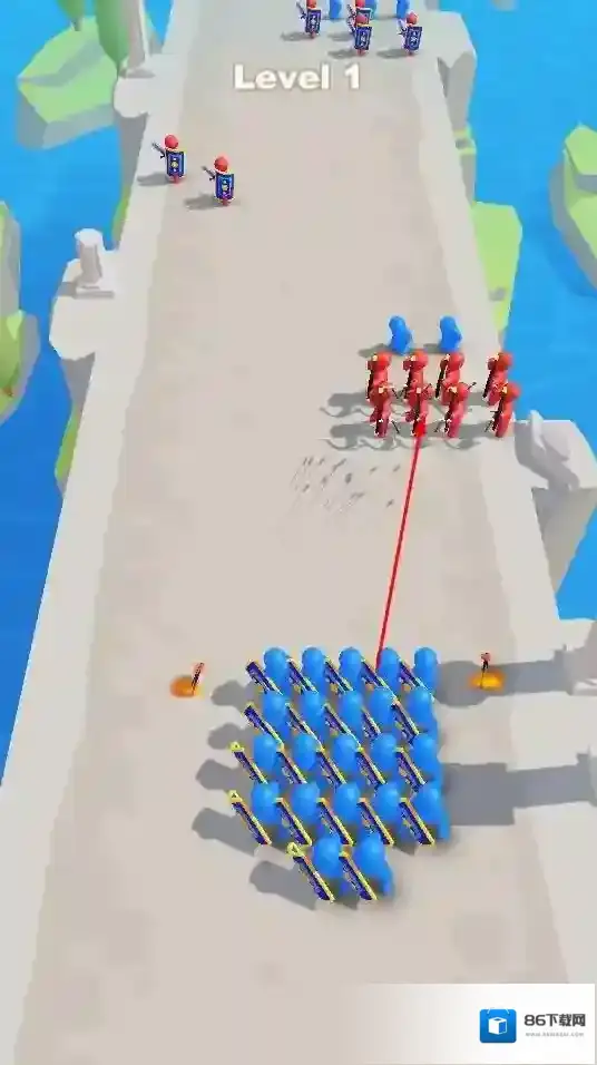 1、玩家操控蓝色小人组成的队伍,在关卡中与红色小人队伍对战,通过合理规划进攻路线,利用队伍优势击败对手。
