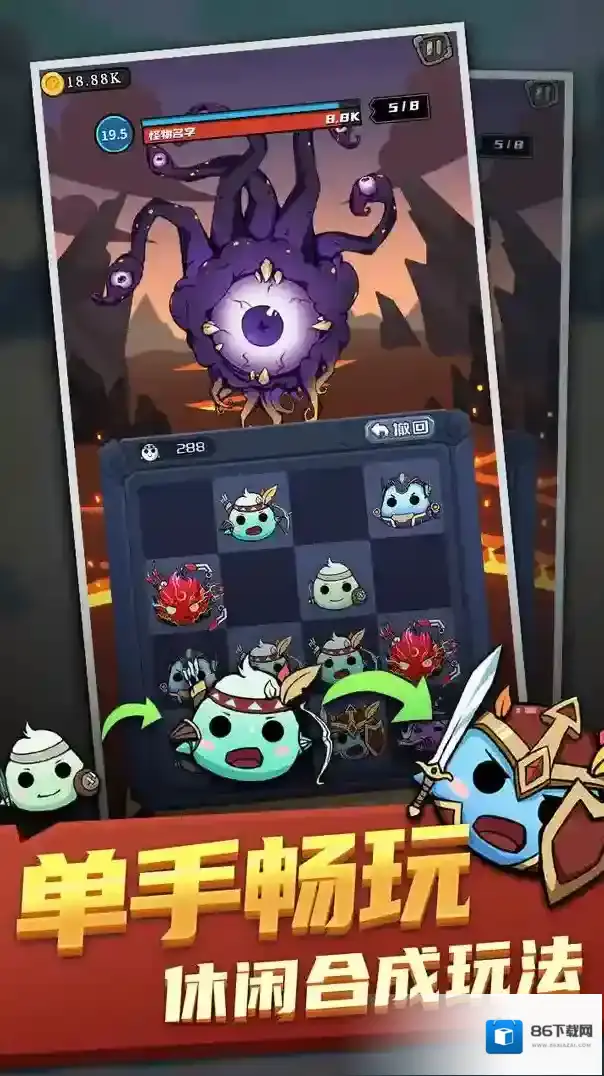 1、合成升级组建阵容:通过滑动屏幕合成相同角色,提升等级与战力,根据怪物属性与关卡特点,从十七种角色中挑选搭配,组建具备攻击防御辅助等多元能力的战斗阵容。