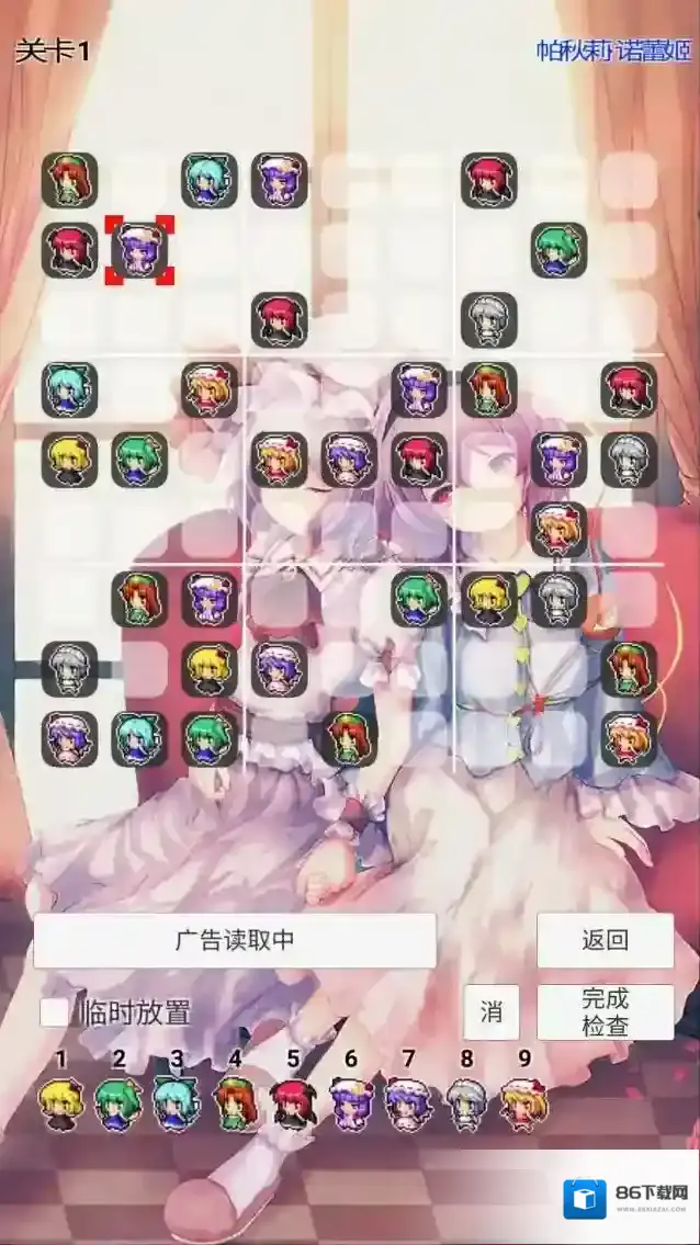 2、在关卡1的网格布局界面,观察底部角色栏(含9种不同东方角色),通过拖拽操作,将角色放置到网格对应位置,遵循数独规则。