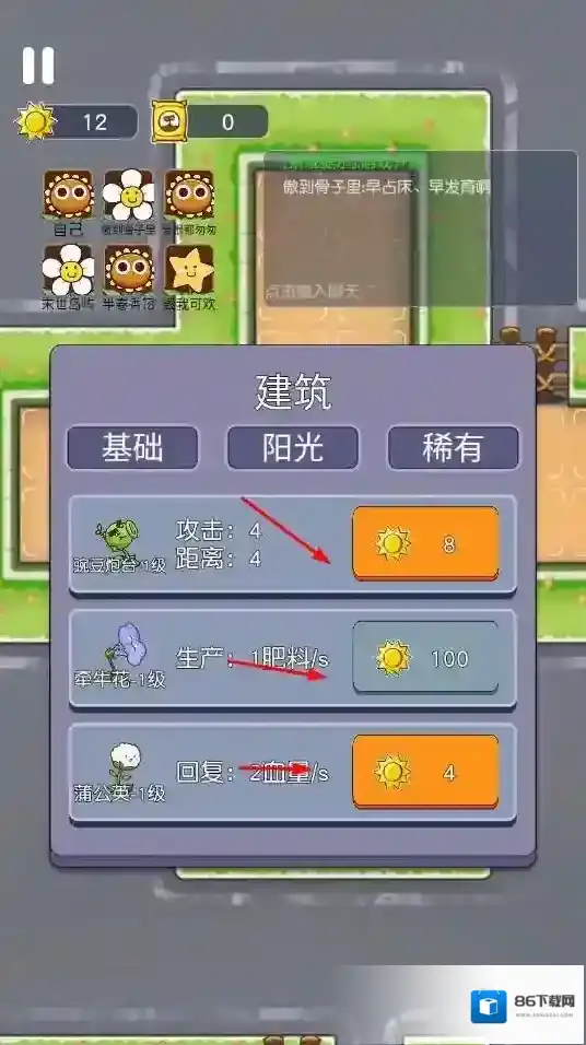 1、“种植植物”,消耗阳光,在领地种植豌豆炮台(攻击)、牵牛花(产肥料)等植物,构建防线。