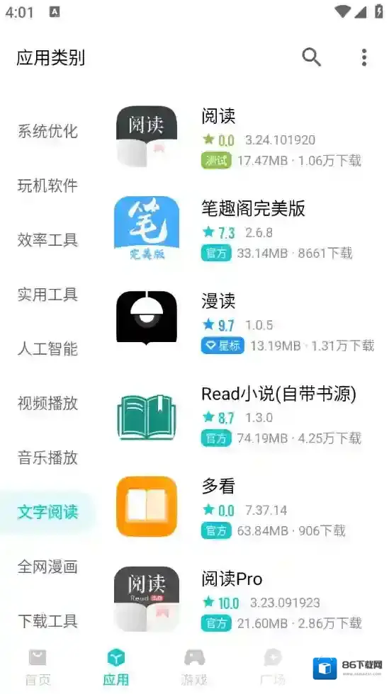3、在“应用”页面,左侧栏目有详细的应用分类,包括影视、小说以及漫画等等类型。