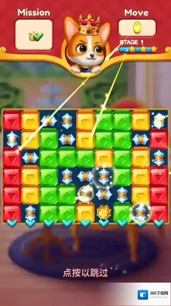 2、关卡内珠宝与城堡元素交织,尝试交换相邻珠宝,让三颗及以上同色珠宝相连,就能看到它们爆破消除时的萌趣效果。