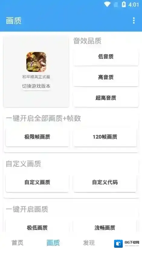 接着,打开画质助手功能,它支持修改吃鸡游戏的画质与音效等设置,并能开启高达120帧及极限帧的画质选项。