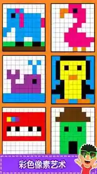 1、在像素填色模式下(如图像中像素画示例),玩家可选择不同的像素图案(如动物图案)。