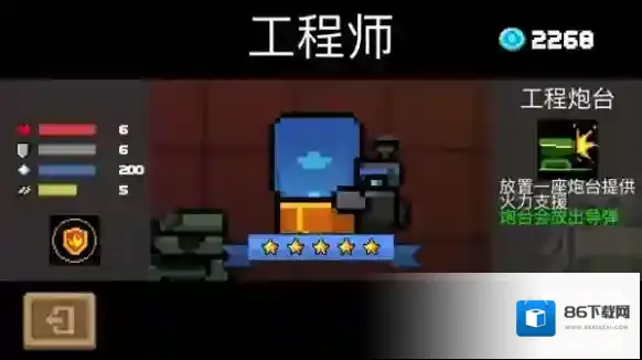 技能1:工程炮台:放置一座炮台提供火力支援。满级后炮台能放出导弹。