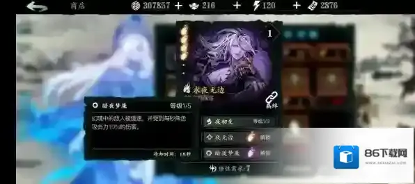 永夜无边:1绝技增加杀意,装备中散搭杀意流套装的话很实用,前中期杀意不足用这个也很好;2绝技让敌人在一定时间内无法使用任何技能,冷却时间也短,可频繁使用,非常强力,pvp和极致伤害流的pve胜负都在瞬秒间;3绝技可以用来在技能空档期闪避保一波命,辅助输出。
