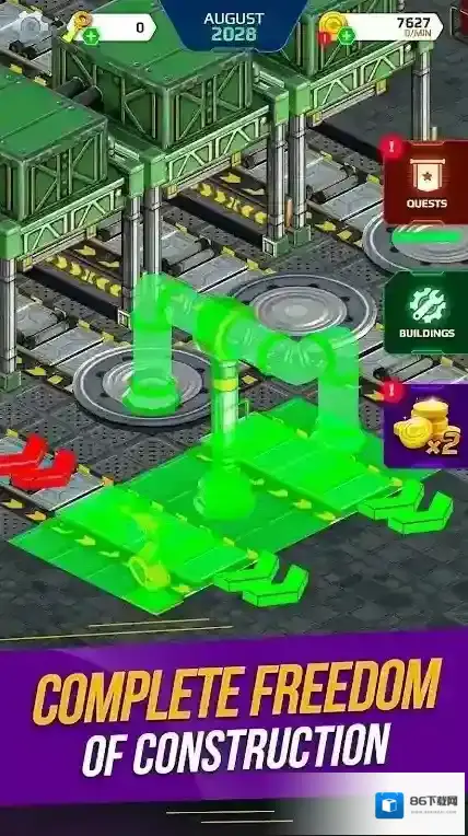 3、货币数值7603、功能按钮GUESTS(访客)、BUILDINGS(建筑),呈现工厂设施(如机械、熔炉等),玩法为管理工厂生产、建设设施、接待访客等。