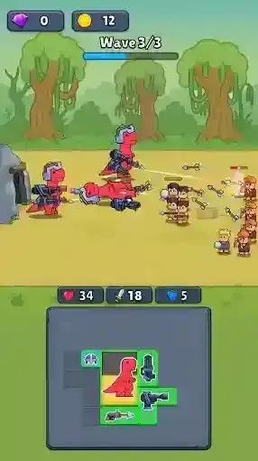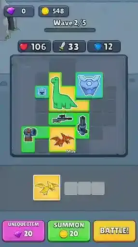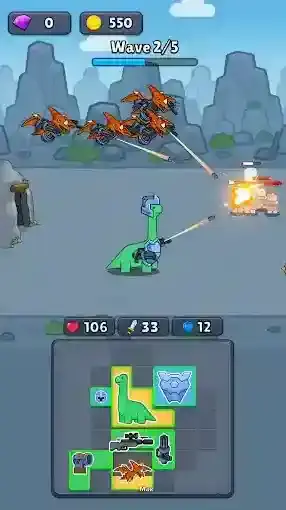 1、在网格上排列你的恐龙和武器,将它们正确排列,并聚集你不可阻挡的恐龙军队,还能装备上武器,去消灭出现的敌人。