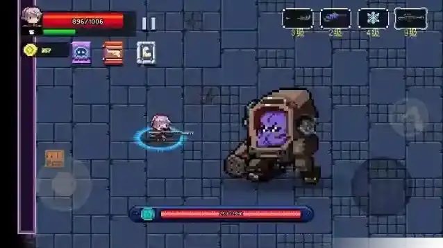 生命值9999,两种攻击模式:①发射环形弹幕 ②翻滚冲撞(参考小紫球,伤害50),翻滚后概率召唤小紫球。推荐用弓箭攻击(易瞄准、伤害高),注意其翻滚速度超过玩家移动速度,需及时闪避。击败后掉落狙击枪,出现关卡2-8。
